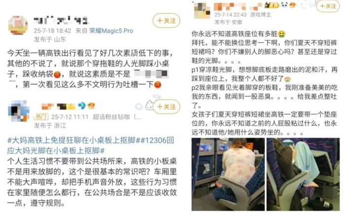 据记者观察,社媒上关于高铁上“脚放小桌板”等不文明行为的讨论层出不穷:不少网友直言“脚味儿太冲,一想到桌板上可能踩过脚就不敢吃东西”、“明明有二维码反馈,为啥没人处理?”网友纷纷表示无法忍受,呼吁铁路部门加强文明出行宣传,为乘客营造一个干净、舒适的乘车环境。