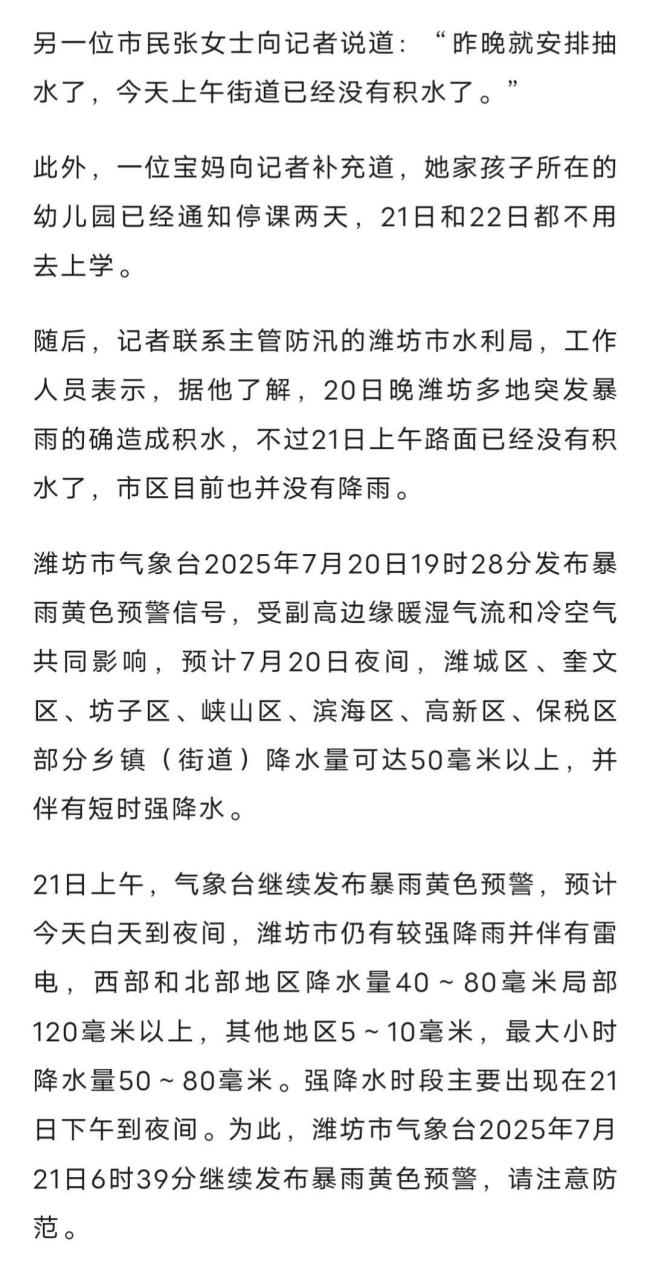 当地居民子枭称,20日晚10点多,潍坊市区大部分路段都出现了积水,仅他自己看到的就有五六辆车被淹,部分街道路段积水严重,昌乐县尤其明显。次日上午雨已停,渍水也已消退,幸运的是,20日晚并未出现人员被困的情况。