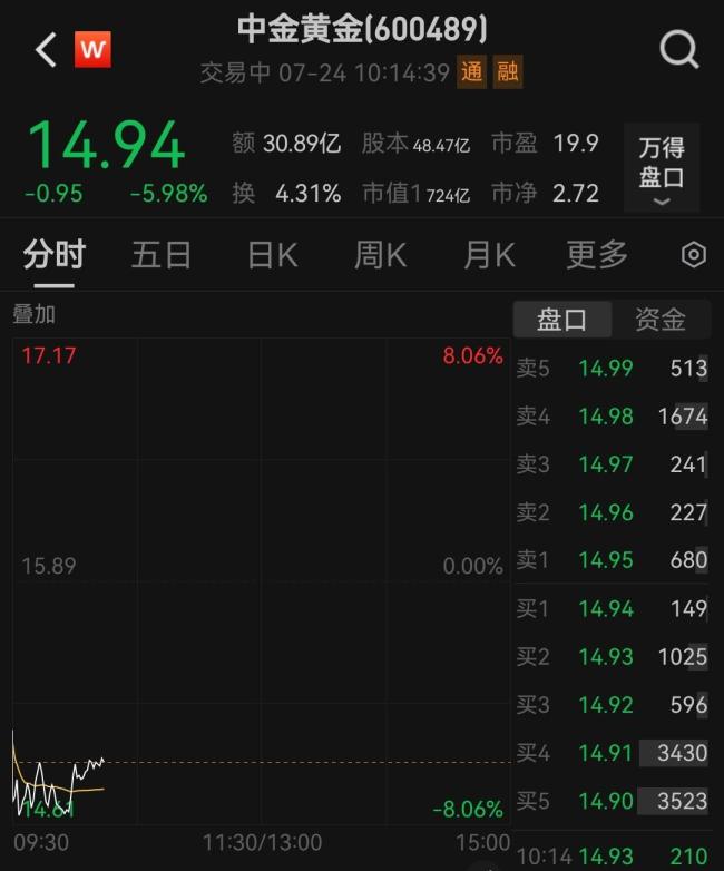 7月24日,中金黄金大幅低开,盘中跌幅一度达8%。截至发稿,股价跌近6%,成交额超过30亿元。