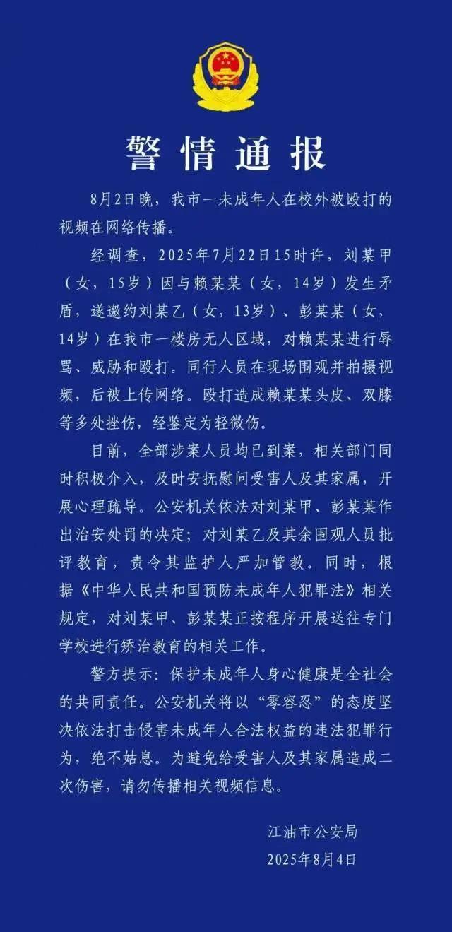 8月4日,四川江油市公安局通报了一起未成年人在校外被殴打的事件。8月2日晚,一段视频在网络上传播,显示一名未成年人遭到殴打。经调查,7月22日15时许,刘某甲(15岁)因与赖某某(14岁)发生矛盾,邀约刘某乙(13岁)和彭某某(14岁),在一处无人区域对赖某某进行辱骂、威胁和殴打。同行人员在现场围观并拍摄了视频,随后将其上传至网络。这次殴打造成赖某某头皮、双膝等多处挫伤,经鉴定为轻微伤。