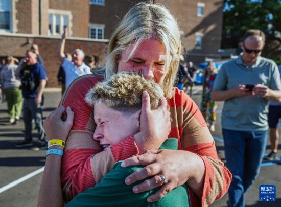 8月27日,在美国明尼苏达州明尼阿波利斯市南部一所学校,一名母亲安慰自己的孩子。新华社/美联