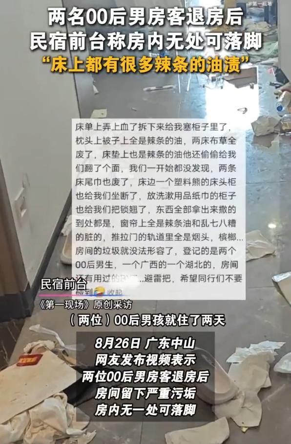 8月26日,在广东中山,有网友发布了一段视频。视频中显示,两名来自广西和湖北的00后男生在住宿期间将房间弄得非常脏乱。退房后,房间内满地都是烟头和槟榔渣,床垫、枕头和被子上沾满了辣条的油渍,柜子的锁也被撬开,床头柜甚至坐断了。整个房间几乎无处可落脚,十分脏乱。