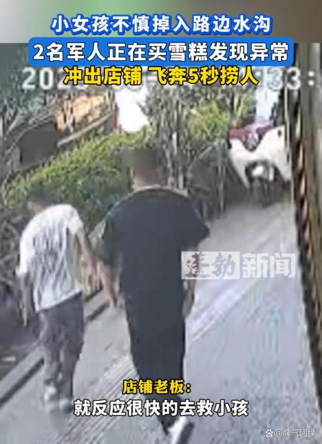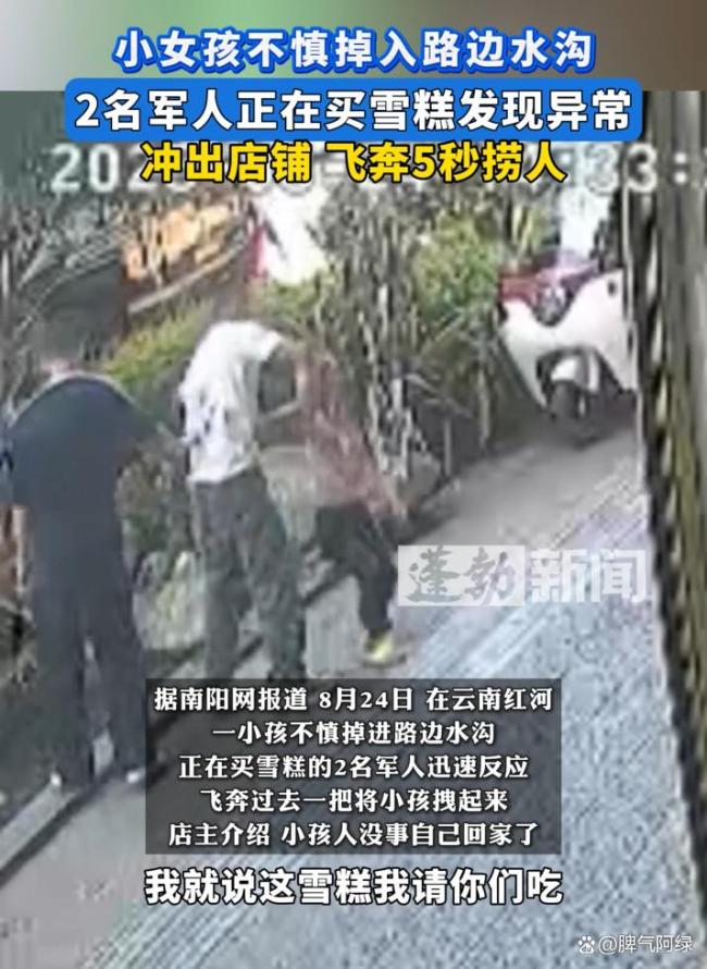小女孩落水两名军人飞奔救人 本能的善良!两个买东西的军人让我看到了什么叫本能的善良。那一刻,他们跑得比谁都快。当危险真正来临时,谁会第一个冲上去?今天看到的一段视频让我眼眶一热。9月1日,在云南红河一个普通的午后,两个军人正在路边小店购物。突然,外面传来呼救声——一个小女孩掉进水里了。