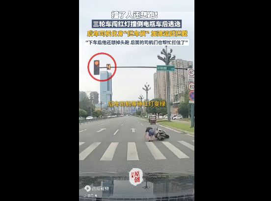 "想跑?先让你6秒。"8月16日,在成都街头,一辆三轮车在路口还是10秒红灯的情况下,选择了闯红灯。之后,撞上从路边人行道正常行驶的电瓶车。电瓶车被撞翻,车主也随之倒地,但三轮车却丝毫没有停下来查看的意思,竟直接一个加速,逃之夭夭。