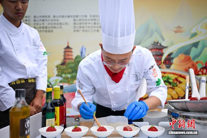 9月27日,一场精彩的厨艺技能大赛在四川眉山市东坡区太和公园星光湾举行。专业与业余选手同台竞技,为现场民众及游客呈现了一场兼具视觉与味觉的美食品鉴盛宴。图为一名参赛厨师正在制作参赛菜品“眉州凉拌鸡”。中新社记者 刘忠俊 摄