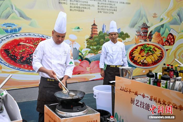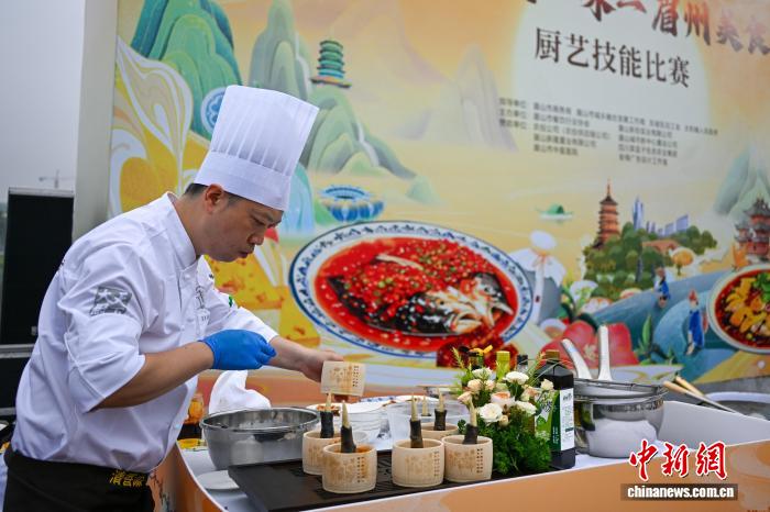 9月27日,一场精彩的厨艺技能大赛在四川眉山市东坡区太和公园星光湾举行。专业与业余选手同台竞技,为现场民众及游客呈现了一场兼具视觉与味觉的美食品鉴盛宴。图为参赛厨师正在进行指定菜品制作比赛。中新社记者 刘忠俊 摄