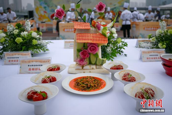 9月27日,一场精彩的厨艺技能大赛在四川眉山市东坡区太和公园星光湾举行。专业与业余选手同台竞技,为现场民众及游客呈现了一场兼具视觉与味觉的美食品鉴盛宴。图为“麻辣翘壳鱼”等参赛菜品吸引民众驻足拍照和观赏。中新社记者 刘忠俊 摄