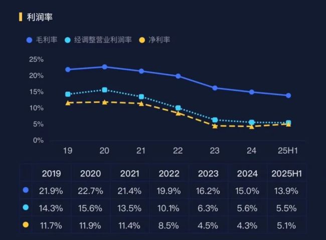 还有盈利能力,近几年上游铜材价格上涨,外加下游消费电子、汽车、通信等行业价格战,新亚电子的毛利率从2019年的21.9%下滑至2024年的15.0%,差了将近7个百分点。
