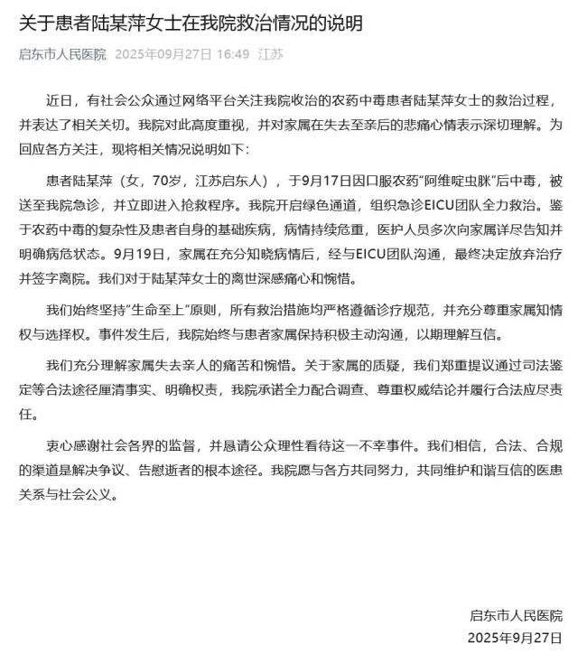 9月27日,江苏启东市人民医院发布了关于患者陆某萍女士的救治情况说明。近日,有社会公众通过网络平台关注该院收治的农药中毒患者陆某萍女士的救治过程,并表达了相关关切。医院对此高度重视,并对家属失去至亲后的悲痛心情表示深切理解。