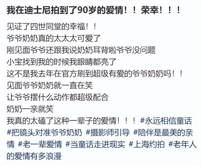 童话故事通常以“王子和公主从此幸福地生活在一起”结尾。近日,不少网友在上海迪士尼拍到一对很有爱的老年夫妇,不少人直呼“童话照进现实”,“我看到王子公主老去的样子了”。