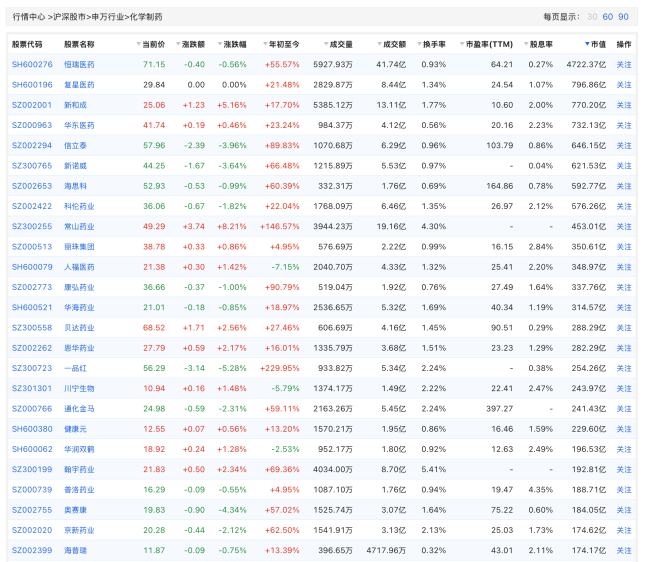 赛柏蓝查询雪球数据发现,年初至今,化学制药企业中,不少药企市值涨幅超过50%,如恒瑞医药(+55.57%)、常山药业(+146.57%)、一品红(+229.95%)等。