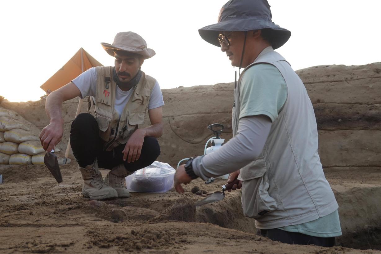 “杨队,发现两个陶罐!”队员的一声呼喊,把中沙联合考古队中方领队杨睿引了过去。“周边先整体撒水,刮出遗迹轮廓来。”连续几周的暴晒,杨睿的脸已经成了古铜色。他叮嘱队员:“这一对陶罐在房址外分布,功能是什么还不清楚。一定先把遗迹线划清楚,等整体揭露到这层,我们再看它们有什么特殊的地方?”