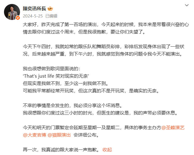陈奕迅曾因取消演唱会在社交媒体道歉