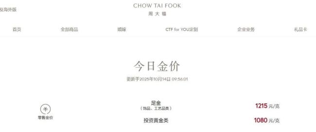 10月14日,现货黄金首次涨至4150美元/盎司关口,续刷历史新高。年内累计上涨超1500美元,涨幅达58%。受国际金价影响,珠宝品牌足金首饰价格也出现上涨。周生生足金饰品价格从昨日的1188元/克涨至1213元/克,上涨25元/克。周大福今日金饰价格为1215元/克,较昨日上涨25元/克。