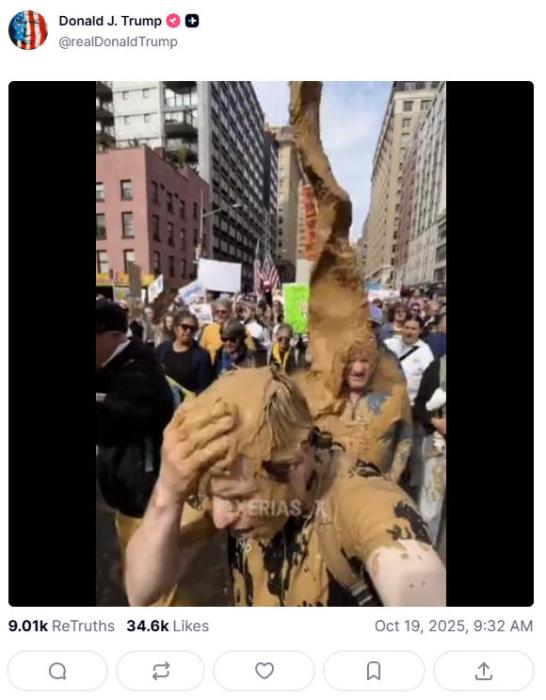 最近,美国总统特朗普发布了一段AI视频。画面中,他头戴王冠,驾驶战机,向游行人群投下褐色泥浆状物体。