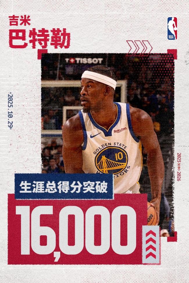 比赛结束后,巴特勒的职业生涯总得分达到16000分,超过了这一里程碑。目前在现役球员中,排在他前面的是掘金球星尼古拉-约基奇,后者总得分为16270分。