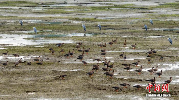 每年10月开始,大批候鸟会随着冷空气南下飞抵鄱阳湖越冬。在鄱阳湖湖口刘星咀水域,退水后的滩涂地裸露出来,湖滩上成群越冬候鸟或低空盘旋、或低头觅食、或交颈私语,悠闲自得,构成一幅动人的生态画卷。