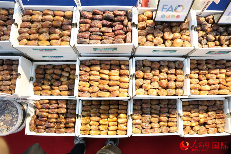 一名参展商展示椰枣产品。人民网 伊纳斯·易卜拉欣摄