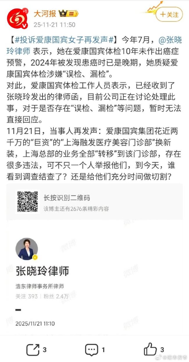 在爱康国宾体检10年未作出癌症预警、2024年被发现患癌时已是晚期的张晓玲律师,针对她质疑的爱康国宾体检涉嫌“误检、漏检”,当事人再发声:爱康国宾集团花近两千万的“巨资”的“上海融发医疗美容门诊部”换新装,上海总部的业务全部“转移”到该门诊部,存在很多违法,可不只一个人举报他们,到今天,谁看到调查结查了?还是给他们充分时间做切割?