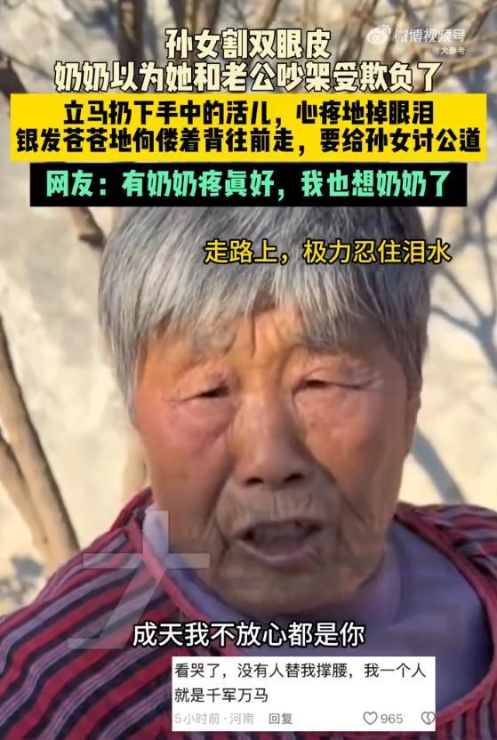 孙女割双眼皮奶奶以为被打心疼落泪 奶奶的爱感动网友!“你的眼咋肿了?谁打你了?”河南一女孩割双眼皮后回家,奶奶以为她和老公吵架受欺负了,立马扔下手中的活儿,心疼地掉眼泪,银发苍苍地她佝偻着背往前走,要给孙女讨公道。网友:有奶奶疼真好,我也想奶奶了。
