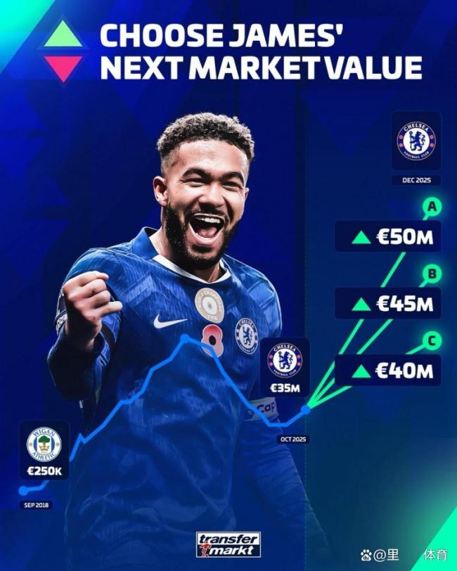 根据最新转会市场数据,里斯-詹姆斯的身价有望进一步上涨,目前他的估价在5000万至4000万英镑之间,高于他现有的3500万英镑。此外,里斯-詹姆斯的回归不仅让切尔西满意,也让国家队主帅图赫尔感到高兴。只要里斯-詹姆斯保持出勤率,他将有机会成为国家队主力。