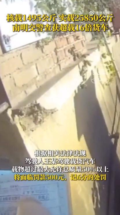 近日,贵阳市公安交通管理局南明区分局查获了一批严重超载的货车。其中一辆轻型自卸货车核定载质量为1495公斤,实际载货质量却达到了25850公斤,超载率约为1629%。