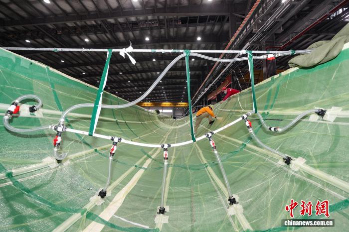 12月11日,工人在对风电叶片壳体进行真空灌注。记者 瞿宏伦 摄