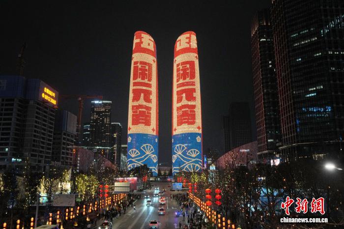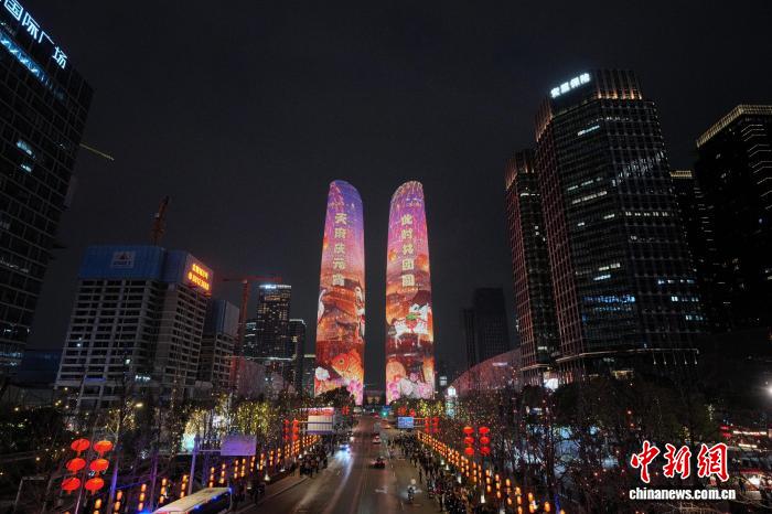 3月3日晚,四川成都,元宵节主题活动上的天府双塔主题光影秀。中新社记者 安源 摄
