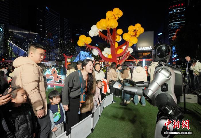 3月3日晚,四川成都,市民在元宵节主题游园会上与机器人互动。中新社记者 安源 摄