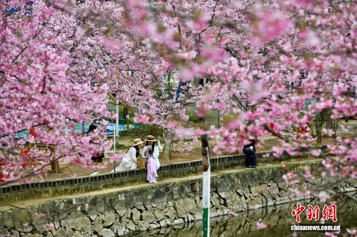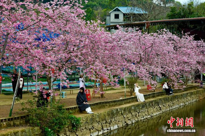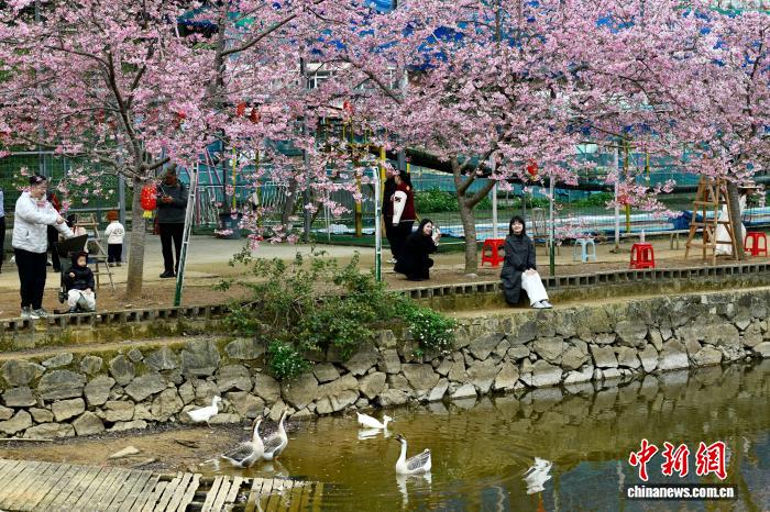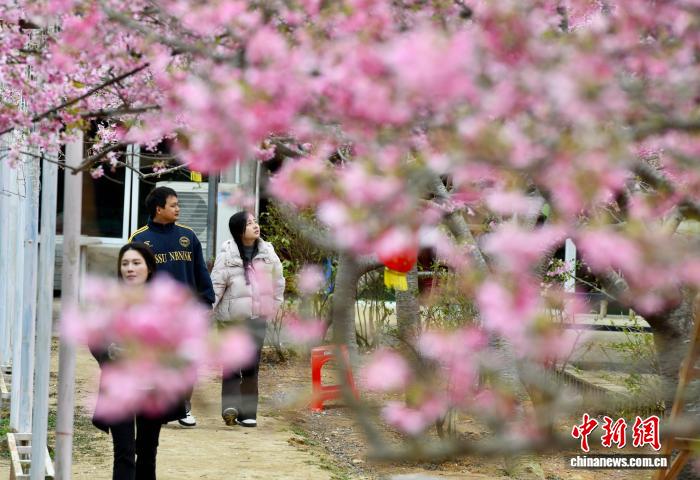3月9日,游客在樱花园里赏花。近日,位于福建省闽侯县龙台山的樱花次第绽放,吸引许多市民和游客前来赏花游玩。中新社记者 王东明 摄