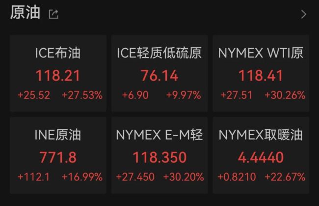 国际油价涨超30% 2026-03-09 蓝鲸新闻 HaiPress 受中东战争动荡影响,今日WTI原油期货暴涨超30%,截至发稿,报118.41美元/桶,为2022年6月以来新高,布伦特原油期货价格涨幅扩大至27%。(责任编辑:zx0600) 免责声明:本文转载自其它媒体,转载目的在于传递更多信息,并不代表本网赞同其观点和对其真实性负责,亦不负任何法律责任。 本站所有资源全部收集于互联网,分享目的仅供大家学习与参考,如有版权或知识产权侵犯等,请给我们留言。 最新 三环华兰王强:以产业思维破局,以责任担当赋能板材行业蝶变 小猿AI学习机T6荣登三大电商平台4000-5000元档学习机销售额第一 清华大学心理与认知科学系携手猿编程成立AI教育研究中心,共筑学术高地 茅台提价,其他白酒跟吗? 友情链接 中文资讯网 数字资产网 区块链网 科技在线 财富综合资讯 女性时尚网 在线新闻 派农源-文化旅游资讯 财经新闻网 环球快讯 世界新闻网 全网新闻门户 全网新闻门户 南方新闻网 四方新闻 猛料新闻门户 安徽新闻网 数码新闻 人人新闻 区块新闻网 日报新闻 奇奇新闻网 上海科技网 信阳新闻 武威新闻 影视追踪 青岛新闻 微商新闻 Global商务 巴士快讯 中国报刊网 东北资讯 平阳网 多维新闻门户 旅行快讯 物联网 5G 模组在线 海外推广资讯 海外发稿网 海外推广