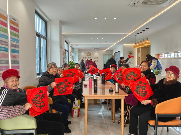 图为社区专业社工和志愿者为老年人开展新春送春联活动。惠山区委社会工作部供图