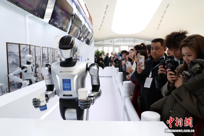 3月25日,2026中关村论坛年会在北京开幕。图为3月24日,在论坛年会主会场,机器人餐吧吸引媒体记者。中新社记者 王紫儒 摄