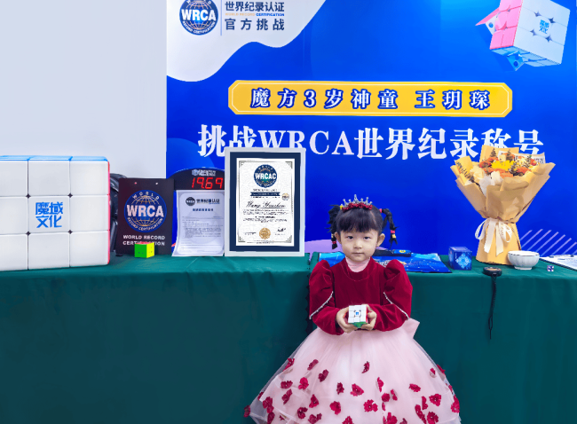 近日,延吉3岁女童王玥琛在WRCA益智类认证官50项世界纪录获得者叶佳希老师与数字华容道世界纪录获得者叶晨佾老师的见证下,用19秒还原了三阶魔方,创造了最小年龄在20秒内还原三阶魔方的WRCA世界纪录。