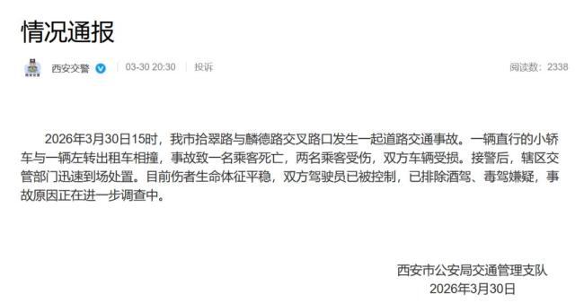 西安路口车祸1死2伤 事故原因正调查。2026年3月30日15时,西安市拾翠路与麟德路交叉路口发生一起道路交通事故。一辆直行的小轿车与一辆左转出租车相撞,事故导致一名乘客死亡,两名乘客受伤,双方车辆受损。接警后,辖区交管部门迅速到场处置。目前伤者生命体征平稳,双方驾驶员已被控制,并已排除酒驾、毒驾嫌疑。事故原因正在进一步调查中。