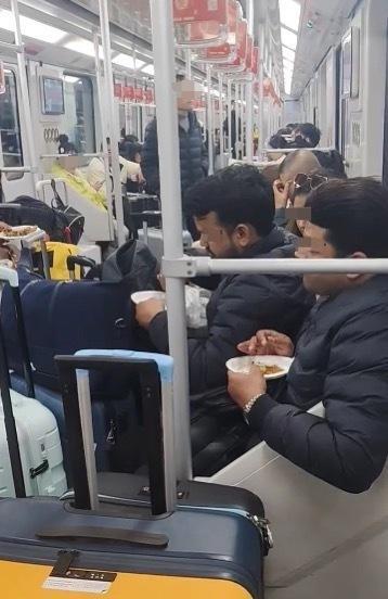 11月25日晚上,上海一名网友发布了一段视频,显示地铁车厢内有几名外籍人士坐在座位上吃馅饼,每个人手里还拿着一个行李箱。这名网友提到车厢里弥漫着咖喱味,但没有说明具体的时间和地点