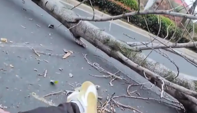 江西一大树突然倒伏横卧马路 骑行者紧急制动摔倒