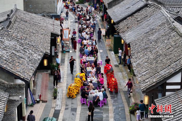 9月27日,四川省眉山市东坡区太和老镇,随着三声“开宴啰”响起,长街宴正式开席。现场50余张桌子座无虚席,凉拌鸡、东坡肘子、太和鲫鱼等经典菜肴依次上桌,吸引了400多名食客沉浸式体验这场充满烟火气的长街宴。图