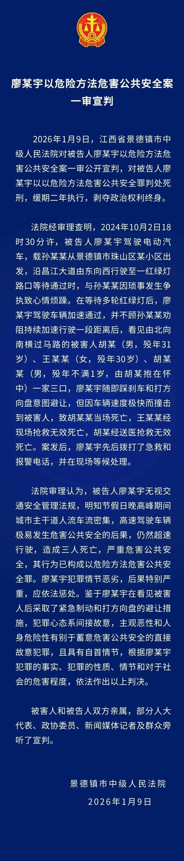 2026年1月9日,江西省景德镇市中级人民法院对被告人廖某宇以危险方法危害公共安全案进行了一审公开宣判。法院判处廖某宇死刑,缓期二年执行,并剥夺其政治权利终身