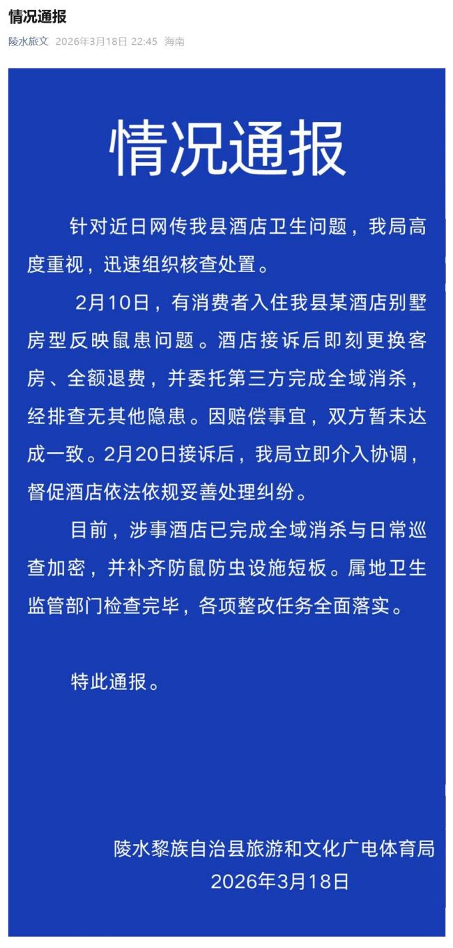 3月18日晚,海南陵水黎族自治县旅游和文化广电体育局发布情况通报,针对近日网传该县酒店卫生问题进行了核查处置。2月10日,有消费者入住该县某酒店别墅房型时反映鼠患问题