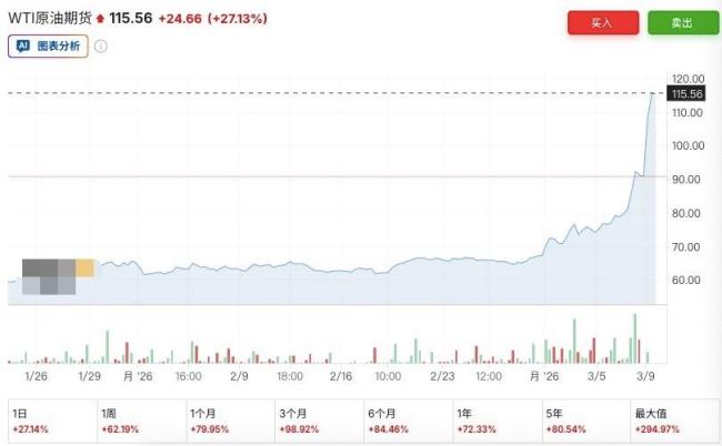 3月9日,国际油价开盘后大幅上涨,自2022年2月以来首次突破100美元/桶,这也是历史上第四次。截至发稿时,WTI原油期货涨超27%,突破115美元/桶;布伦特原油期货涨超25%至116美元/桶