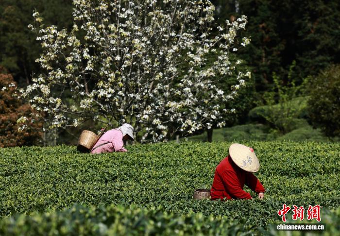 3月20日,正值中国二十四节气的春分,四川省雅安市名山区红星镇骑龙村,茶农在茶园里采摘春茶。中新社记者 王磊 摄